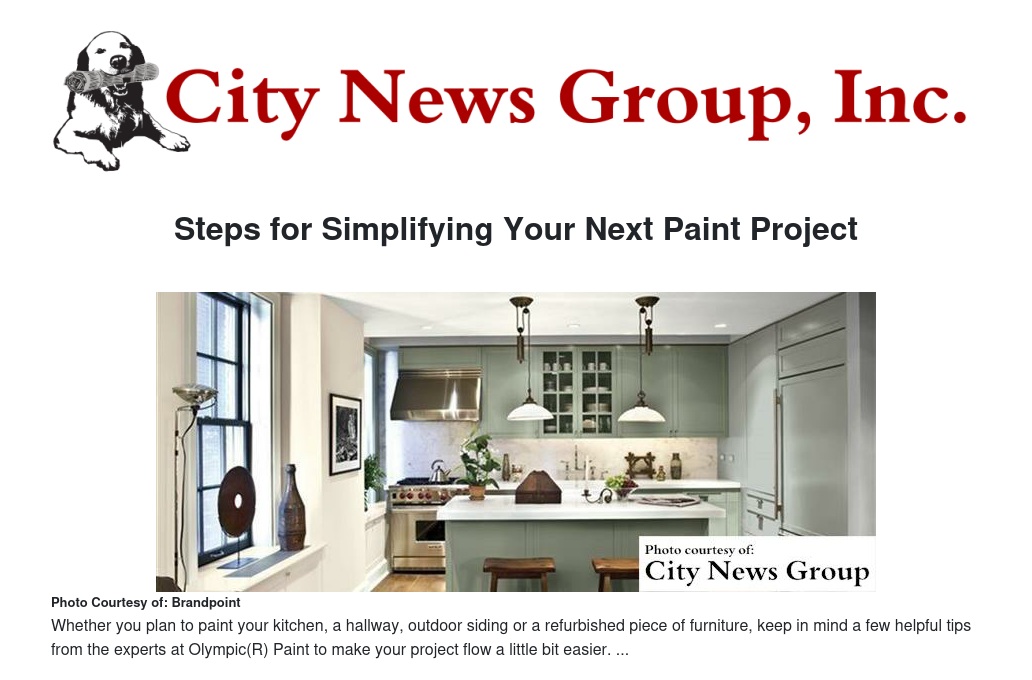 If you're considering a household painting project, now's the perfect time. Whether you plan to paint your kitchen, a hallway, outdoor siding or a refurbished piece of furniture, keep in mind a few helpful tips from the experts at Olympic(R) Paint to make your project flow a little bit easier.