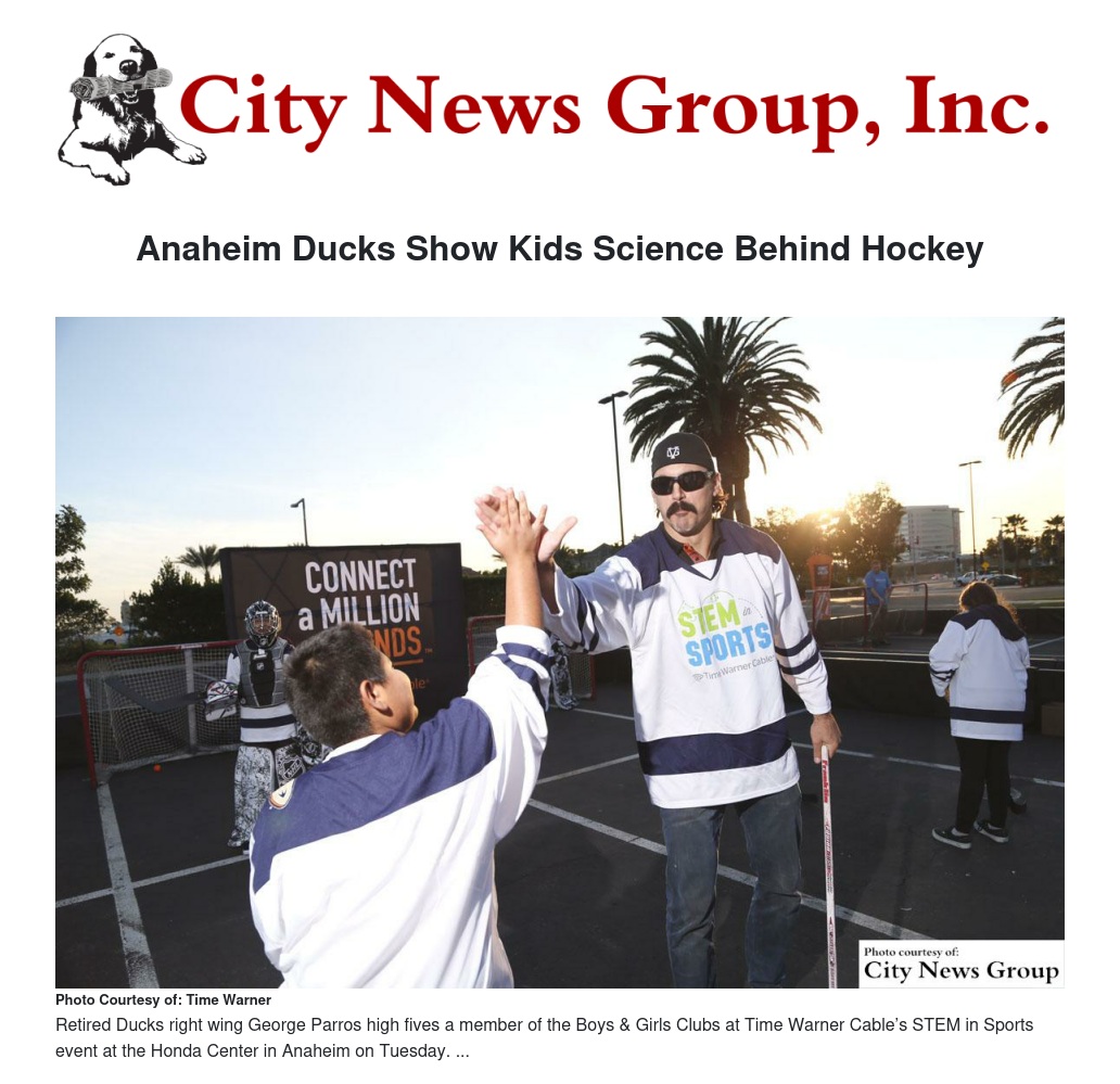 The Anaheim Ducks hosted about 100 youth from the Clubs at the Honda Center as part of Time Warner Cable’s STEM in Sports program, which aims to demonstrate the science, technology, engineering and math (STEM) in various sports. Youth learned the mechanics of a wrist shot, shooting angles and reaction time from former Ducks right wing George Parros and Ducks TV analyst Brian Hayward. They also got a behind-the-scenes tour of the Honda Center.