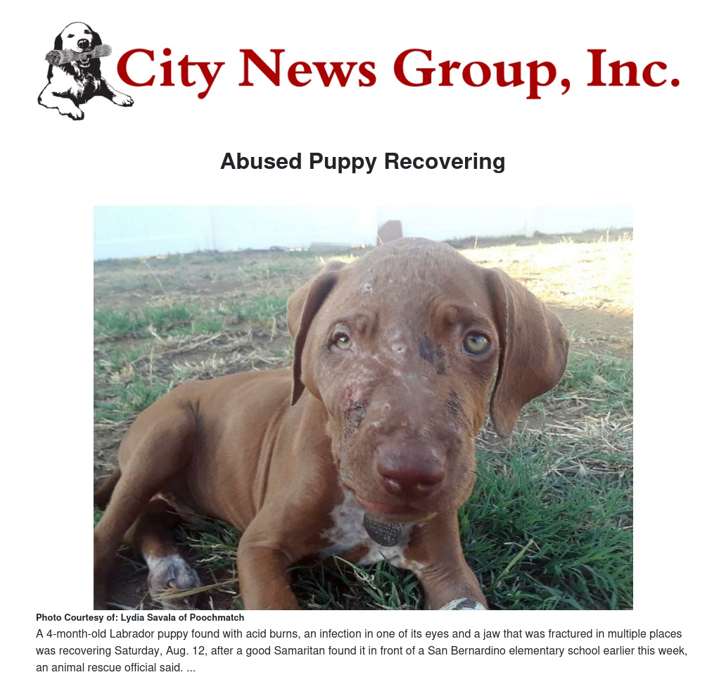 A 4-month-old Labrador puppy found with acid burns, an infection in one of its eyes and a jaw that was fractured in multiple places was recovering Saturday, Aug. 12, after a good Samaritan found it in front of a San Bernardino elementary school earlier this week, an animal rescue official said.