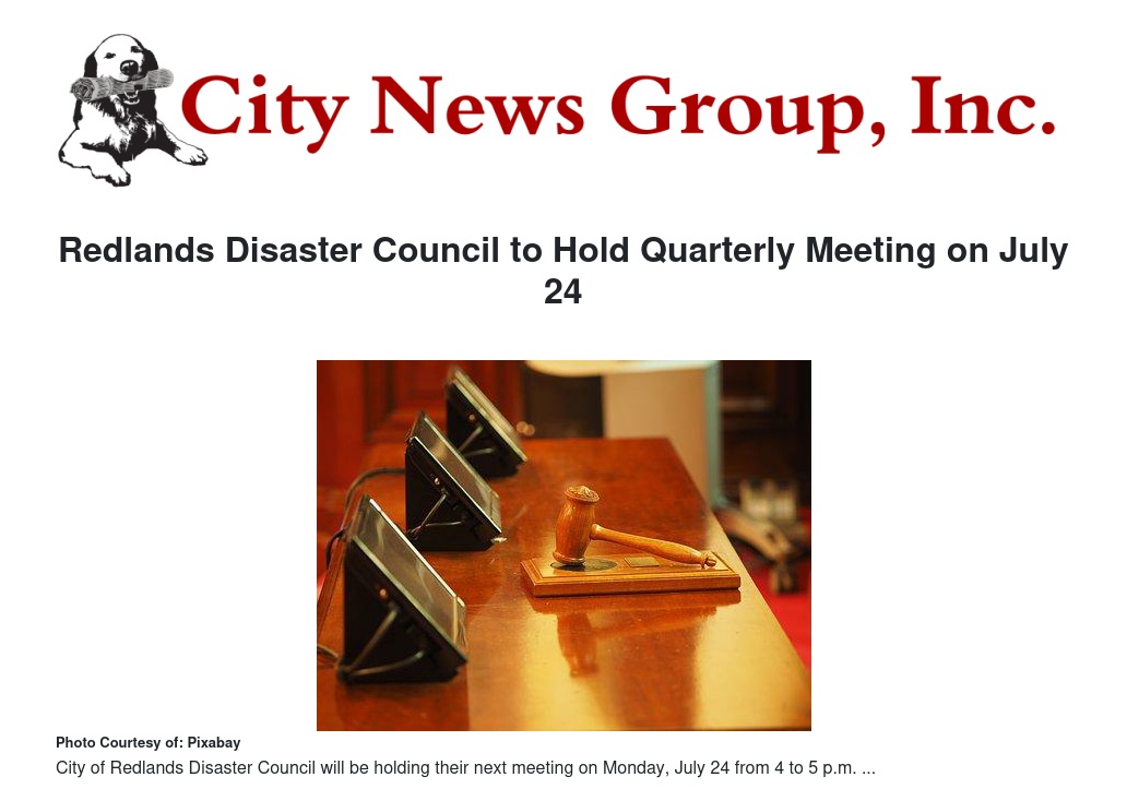 Redlands>>The City of Redlands will holding their next Disaster Council meeting on Monday, July 24 between 4 to 5 p.m. The meeting will take place at the Redlands City Council Chambers, where the community is highly advised to be engaged during their meetings.