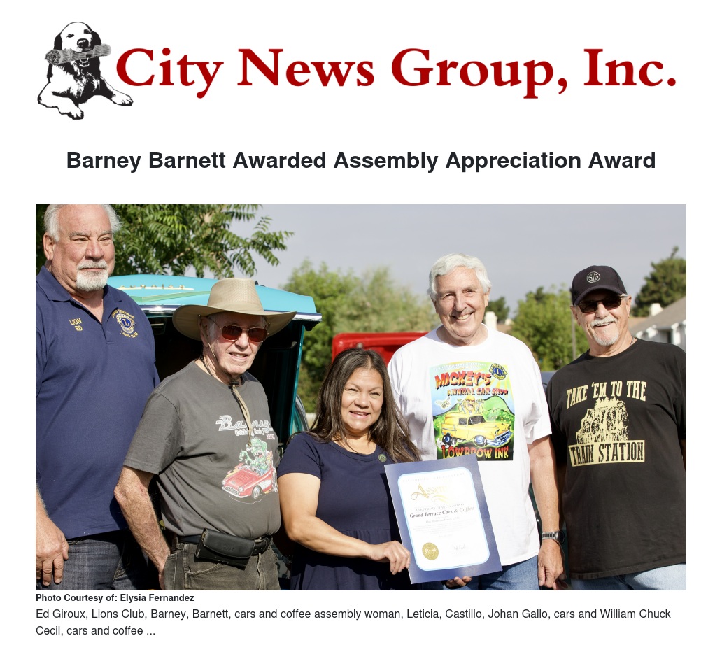An exciting and special day unfolded for Grand Terrace Cars & Coffee, with Assemblywoman Leticia Castillo and her representative, Toni Rosales, gracing the gathering. The highlight of the event was the presentation of a Certificate of Appreciation to local cars & coffee, GT to Johan Gallo and William Chuck Cecil the main men behind the wonderful car group, as well as an award to car enthusiast Barney Barnett, recognizing his commitment to the community by transporting Assemblywoman Castillo during the Blue Mountain Festival Parade.