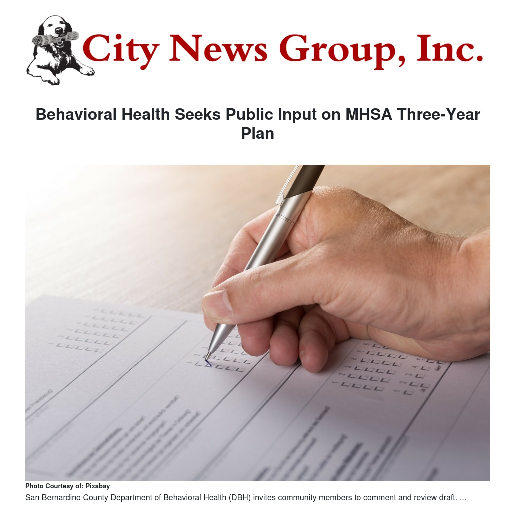 The San Bernardino County Department of Behavioral Health (DBH) invites community members to review and comment on the draft Mental Health Services Act (MHSA) Three-Year Integrated Plan, which includes fiscal years 2023/24 through 2025/26.