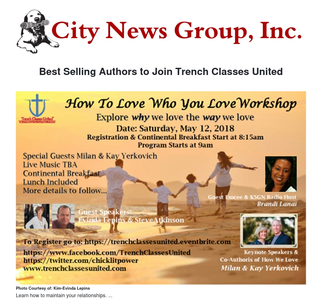Authors of the best-selling book “How we Love” will be joining Trench Classes United for their How to Love Who you Love workshop Saturday, May 12, 2018 from 9-3 at 459 Highland Avenue, Redlands (The River Church). Milan and Kay, joined by Kim-Evinda Lepins (Founder/CEO of TCU) and Steve Atkinson, M.A. Marriage and Family Therapist will be giving you the powerful tools through interactive presentations that are guaranteed to be eye-opening, heartwarming and breathe new life into any of your relationships. Bring your mom, you friend, your spouse, your significant other for a super Saturday!