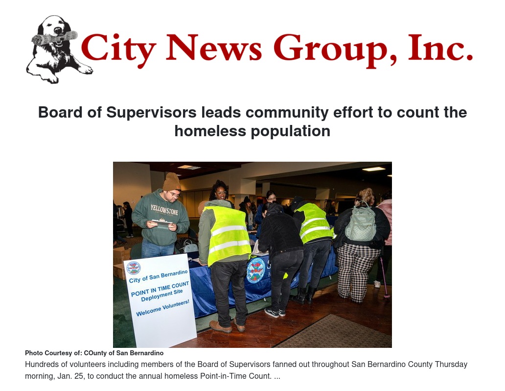 Hundreds of volunteers including members of the Board of Supervisors fanned out throughout San Bernardino County Thursday morning, Jan. 25, to conduct the annual homeless Point-in-Time Count.