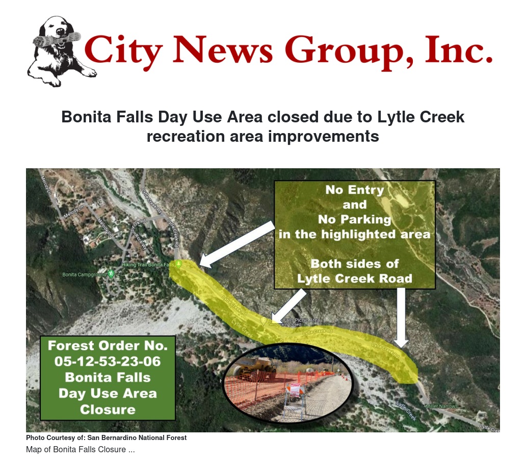 The San Bernardino National Forest has issued a closure order for the Bonita Falls Day Use Area in the Front Country Ranger District. The order is in effect through May 31.