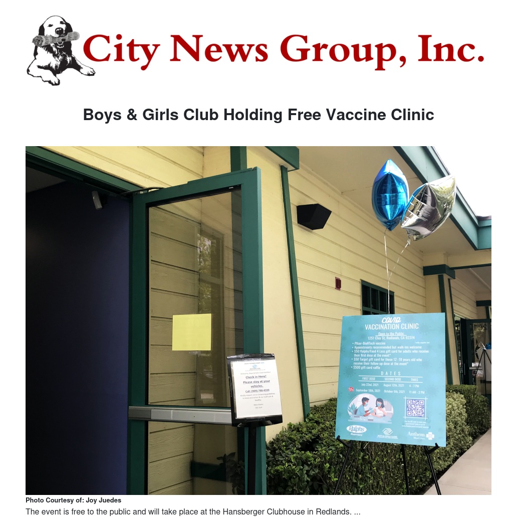 Boys & Girls Clubs of Greater Redlands-Riverside will host a vaccination clinic on Saturday, Sept. 18.