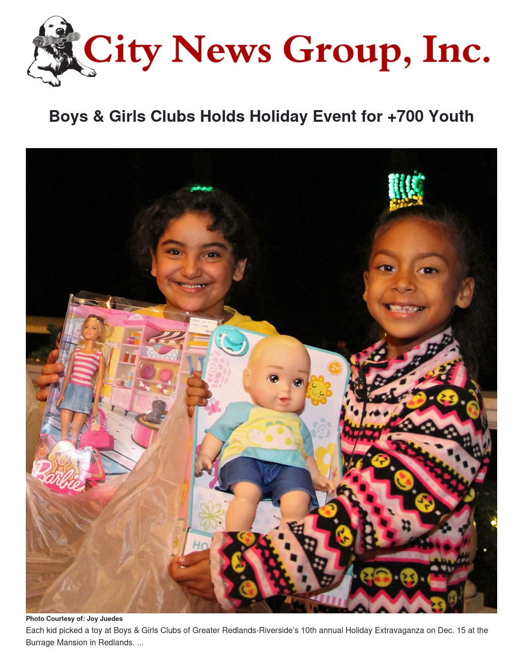 More than 700 youth received toys and met Santa Claus at Boys & Girls Clubs of Greater Redlands-Riverside’s 10th annual Holiday Extravaganza at the Burrage Mansion on Friday, Dec. 15.