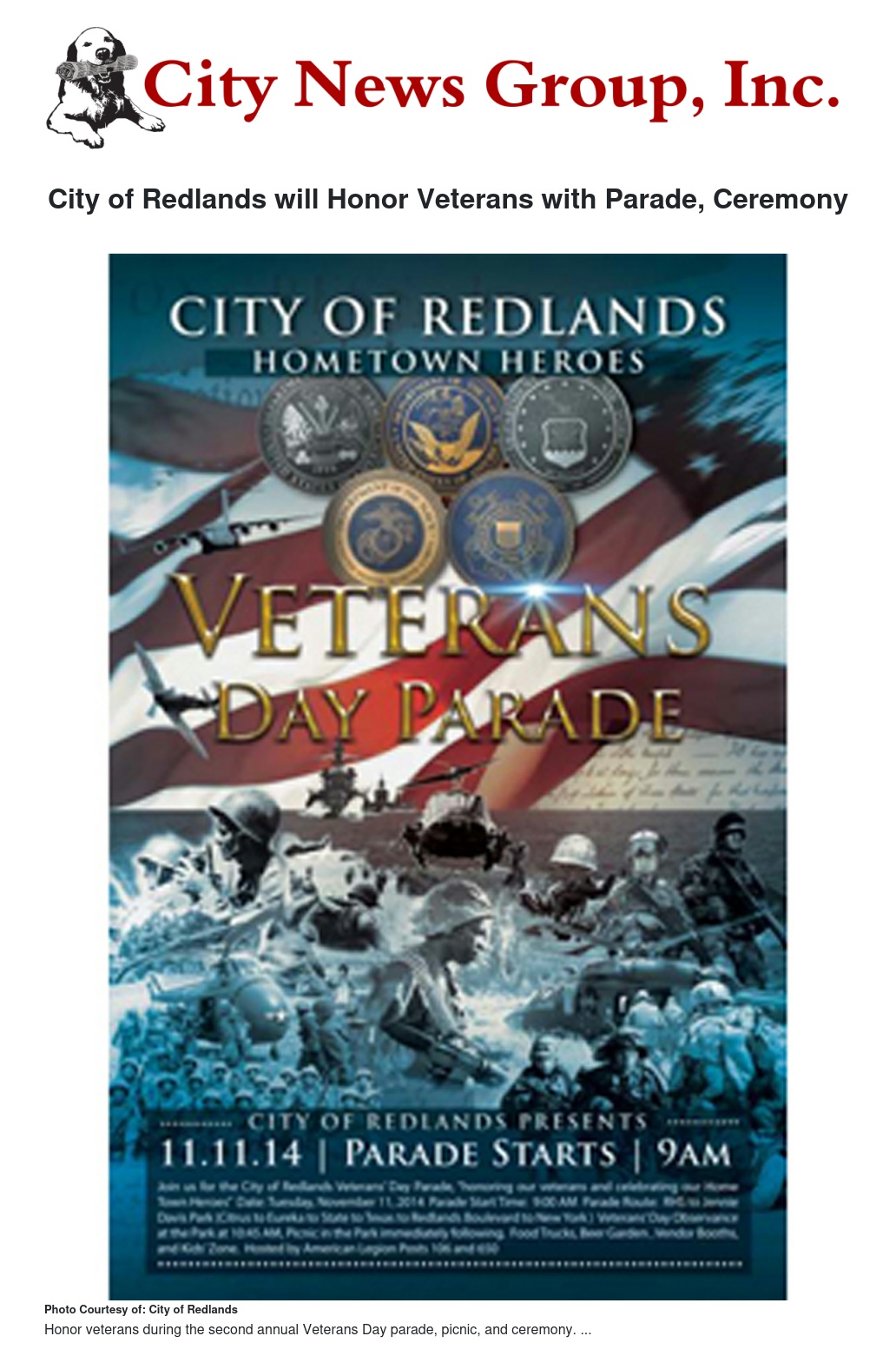 The City of Redlands will honor veterans with its second annual Veterans Day parade on Nov. 11 followed by a picnic and ceremony at Jennie Davis Park.