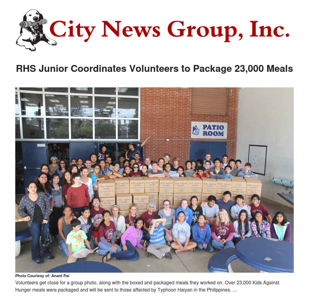 About 23,000 meals on Nov. 17 were packaged by more than 100 volunteers from Redlands High School (RHS), many of them students, led by RHS Junior and Cultures for Youth California Chapter founder Anant Pai.