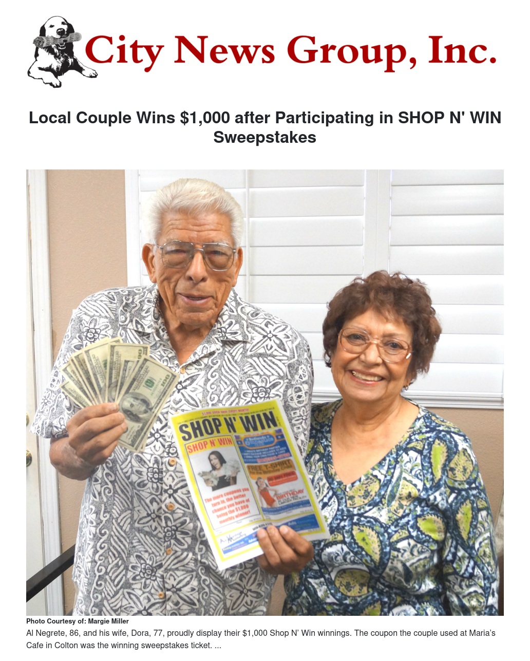 Her husband, Al, who will turn 87 in September, was chosen as the winner of the July Shop N’ Win Sweepstakes, a monthly coupon and sweepstakes book published by Advantage Marketing and distributed by the City News Group. This publication gives residents the chance to win big as they shop at local businesses. This also gives the advertisers an advantage over some competitors. For example, if you want to go out to dinner, why not go to a place that allows you a chance to win $1,000?