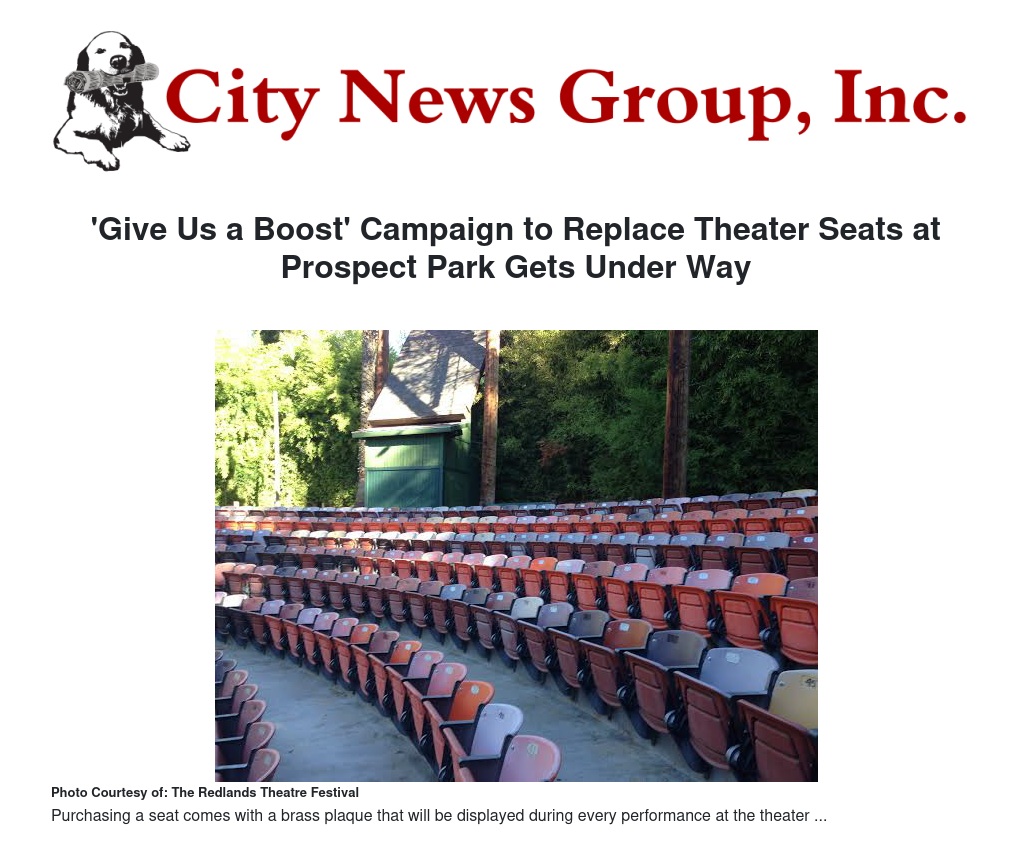 The theater seat campaign is a great opportunity for area theatergoers, companies, clubs, trusts, civic groups and others to give the city of Redlands-owned park and theater a boost in replacing the theater seats, Cabanilla said.