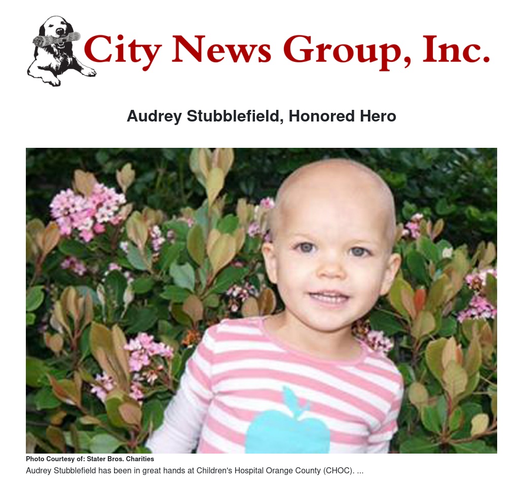 Since her diagnosis, Audrey has been receiving wonderful care at Children's Hospital Orange County (CHOC). Throughout her treatment, she has remained a fighter and her strength has inspired many. She has been in clinical remission since July of 2013 and is looking forward to finishing her treatment in the summer of 2015.
