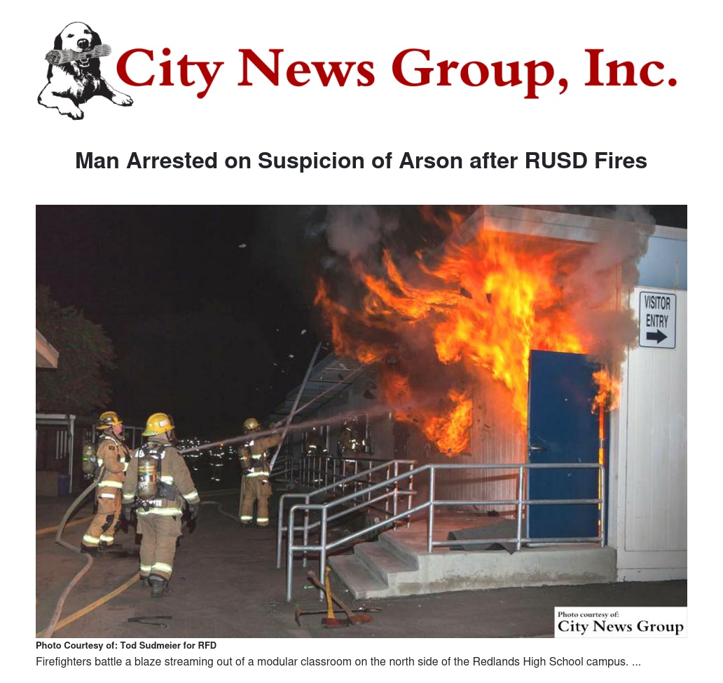Police Lt. Travis Martinez credited the efforts of the Redlands Fire Department, the Redlands Police Department, and the San Bernardino County Sheriff’s Department for the quick identification and apprehension of the suspect.