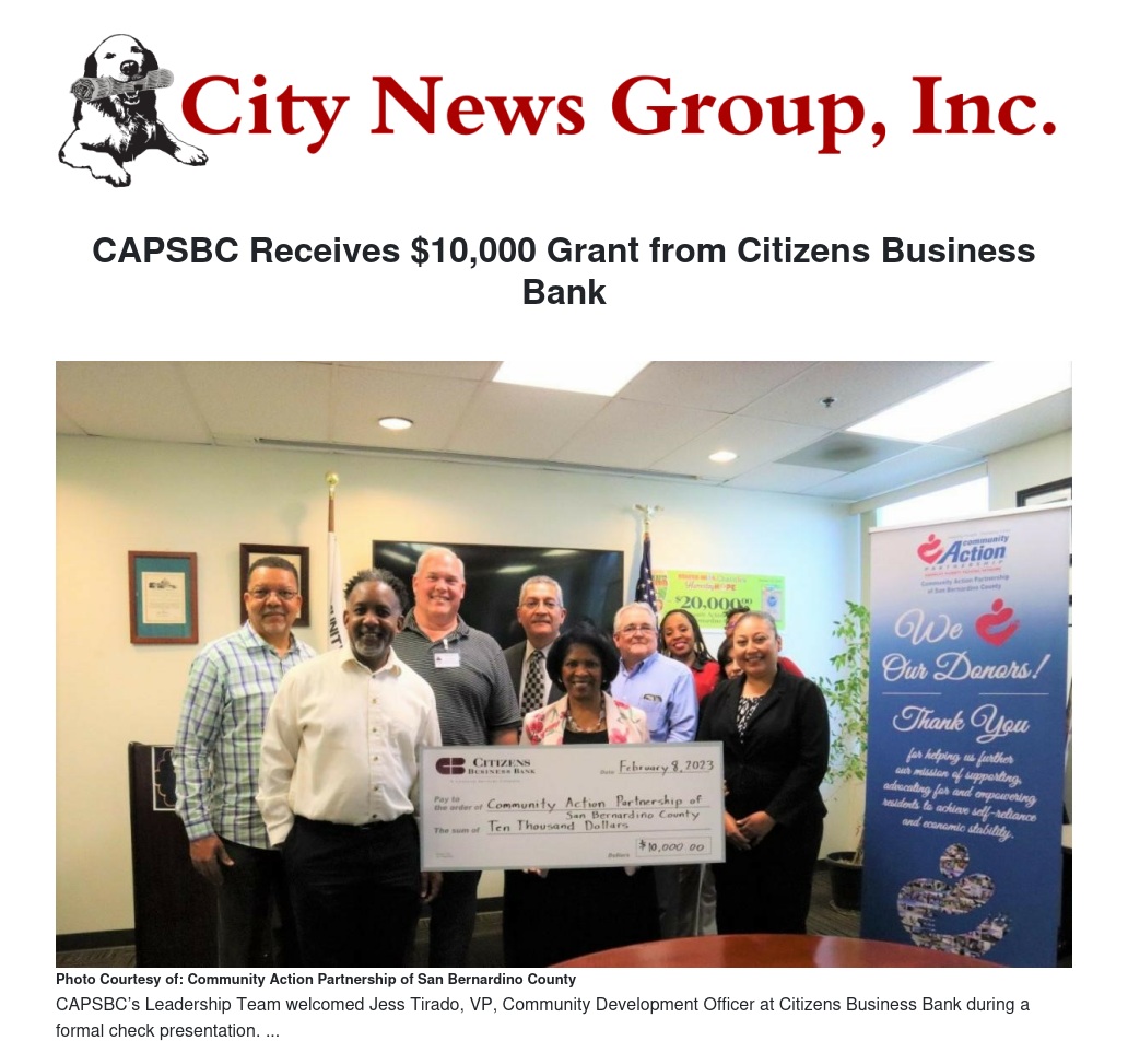 Community Action Partnership of San Bernardino County (CAPSBC) was awarded a $10,000 grant from Citizens Business Bank to support its Family Development Program (FDP) in providing homeless prevention services to individuals and families struggling to pay their housing costs.