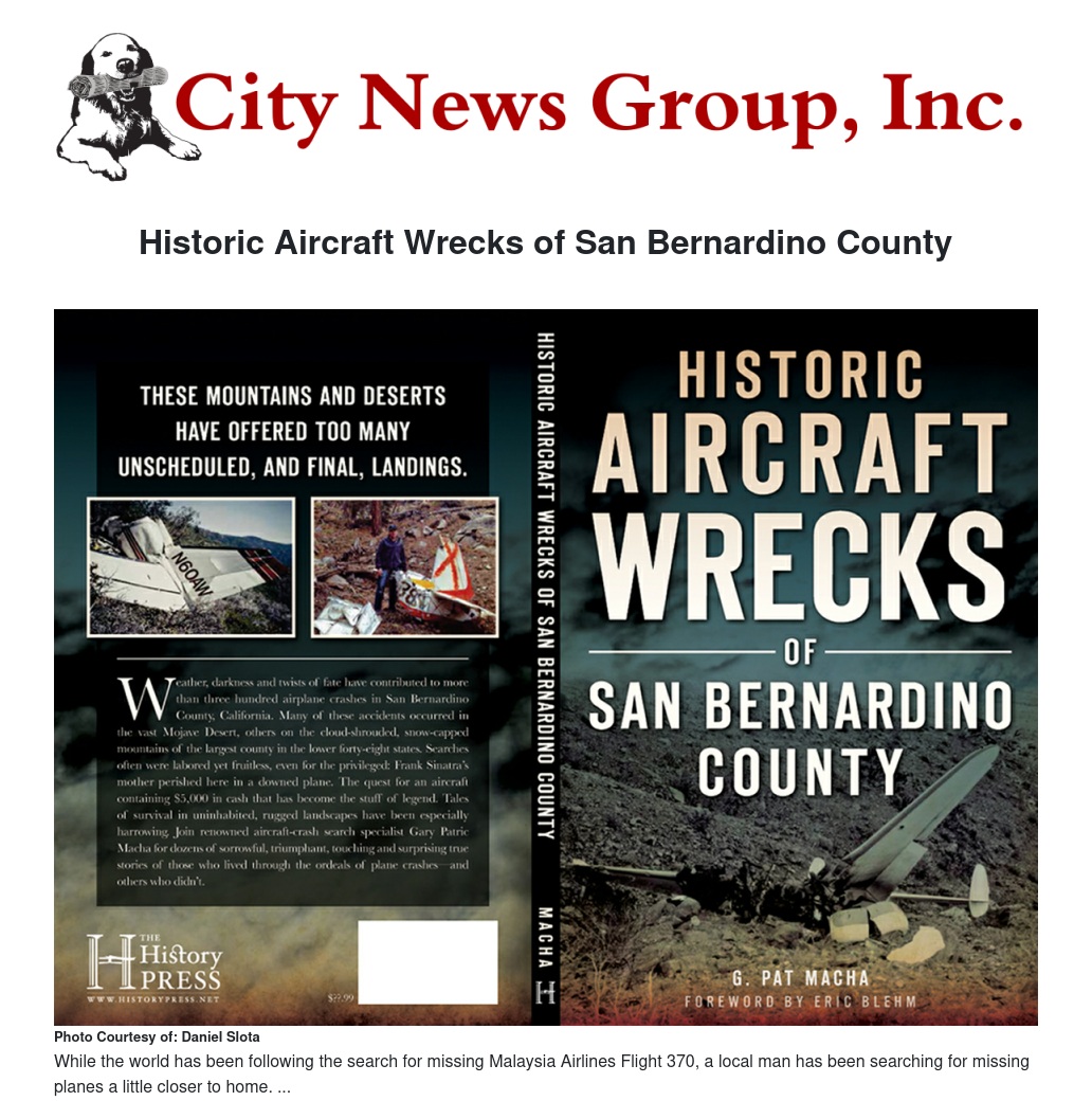 While the world has been following the search for missing Malaysia Airlines Flight 370, a local man has been searching for missing planes a little closer to home. G. Pat Macha will be giving a presentation and slideshow about his book, Historic Aircraft Wrecks of San Bernardino County at the A.K. Smiley Library on May 6th at 6 p.m. Come hear the author speak about his work and experiences while researching many local crash sites.