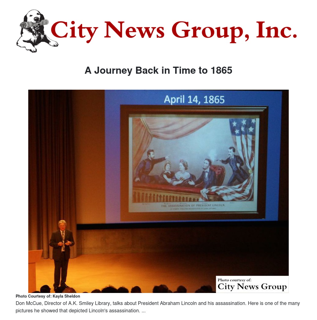 Director of the A.K. Smiley Library and Lincoln Memorial Shrine, Don McCue, is known by the community to be nothing short of an expert when it comes to the 1865 and the “Triumph and Tragedy” that comes along with that year.