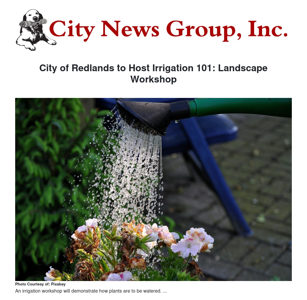 The City of Redlands Water Conservation Division, in collaboration with the A.K. Smiley Public Library, San Bernardino Valley Municipal Water District, and the University of California Cooperative Extension Master Gardeners, will host an Irrigation 101: Landscape Workshop.
