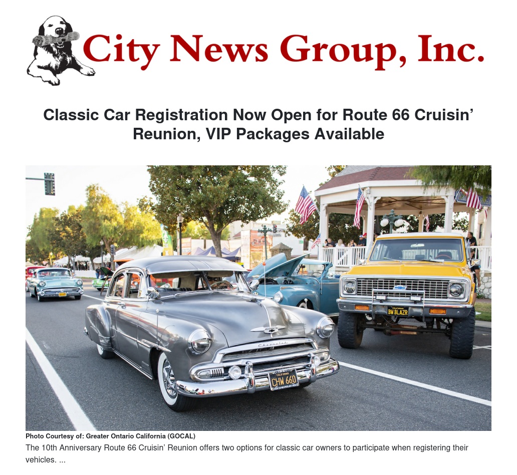 Route 66 Cruisin’ Reunion, powered by Greater Ontario California (GOCAL), has announced the opening of online classic car registration.