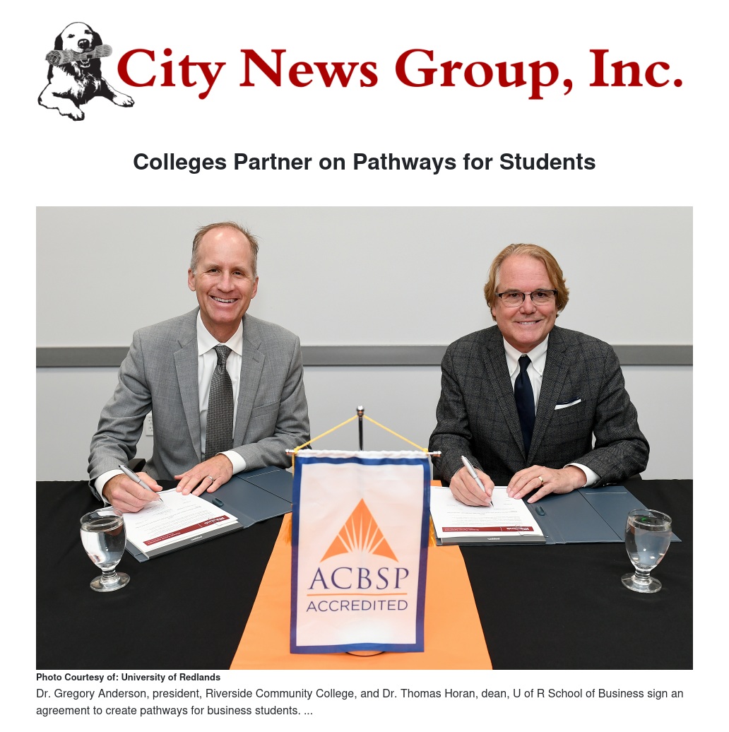 “This agreement reinforces the strong partnership between Riverside City College and University of Redlands. It also builds upon our shared commitment to provide seamless pathways to our students to further their education” said Dr. Gregory Anderson, president of Riverside City College. “Additionally, this agreement recognizes excellence, as both of our institutions have earned accreditation by the Accrediting Council of Business Schools and Programs (ACBSP).”