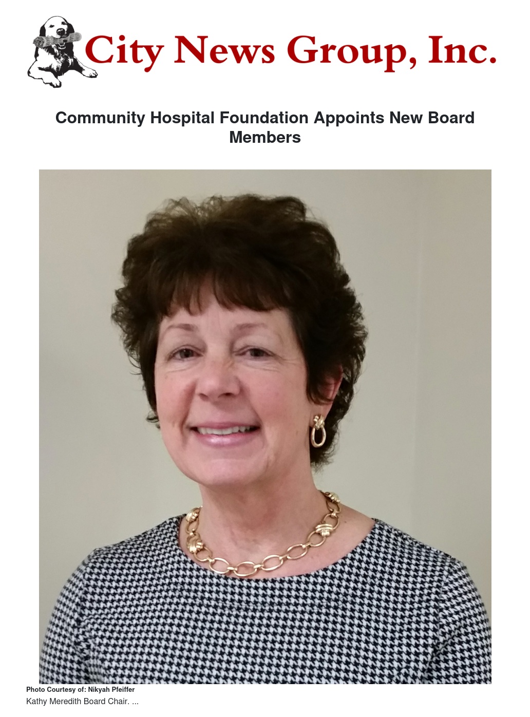 At its meeting this week, the board thanked George Barich, outgoing chair, Joyce Waner and Dave Caminiti for their service to the hospital. The board welcomed new member Betty Auton-Beck in November and newly elected Wendy Brady-Posjena, auxiliary representative.