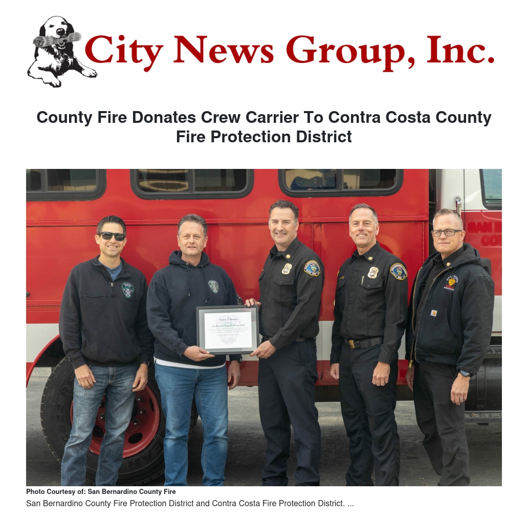 The San Bernardino County Fire Protection District (SBCoFPD) had the honor of donating a surplus 2007 Crew Carrier to the Contra Costa County Fire Protection District (CCCoFPD) in Northern California.