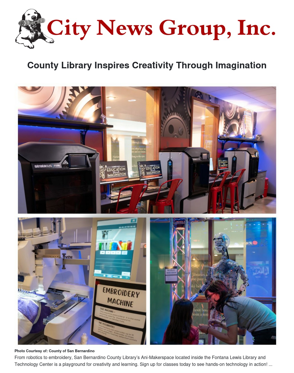 For updated class schedules and registration information, visit the Garner Holt Ani-Makerspace – Library’s webpage and select the “Programs” tab, contact the Fontana Lewis Library and Technology Center at 909-574-4500 or visit the Fontana Lewis Library & Technology Center at 8437 Sierra Ave. in Fontana.