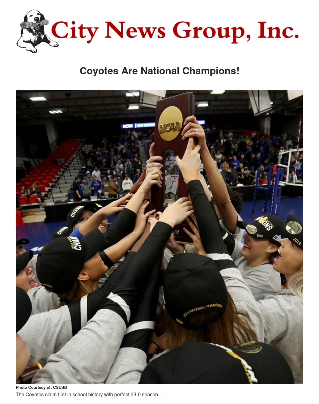 The No. 1 CSUSB Coyotes put a fitting cap on what was a historic season on Saturday night, claiming the NCAA Division II National Championship and perfect 33-0 record with a 3-1 win over No. 2 Nebraska Kearney in Denver in the National Championship Match from Metro State.