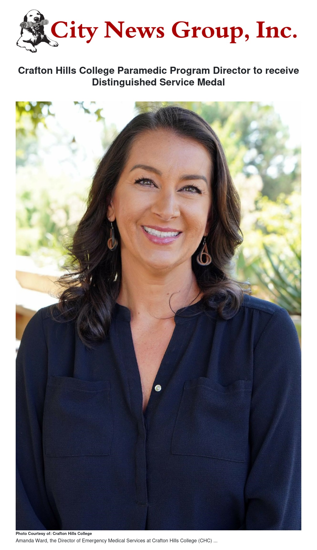 Amanda Ward, the Director of Emergency Medical Services at Crafton Hills College (CHC), has been honored with the 2023 Distinguished Service Medal by the California Emergency Medical Service Authority (EMSA) in acknowledgment of her dedicated service.