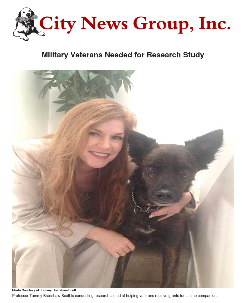 Local professor Tammy Bradshaw-Scott has announced she is conducting research aimed at further exploring the potential benefits of canine companions paired with military veterans. She is seeking the help of veterans willing to participate in an online survey that may be completed in less than 30 minutes.