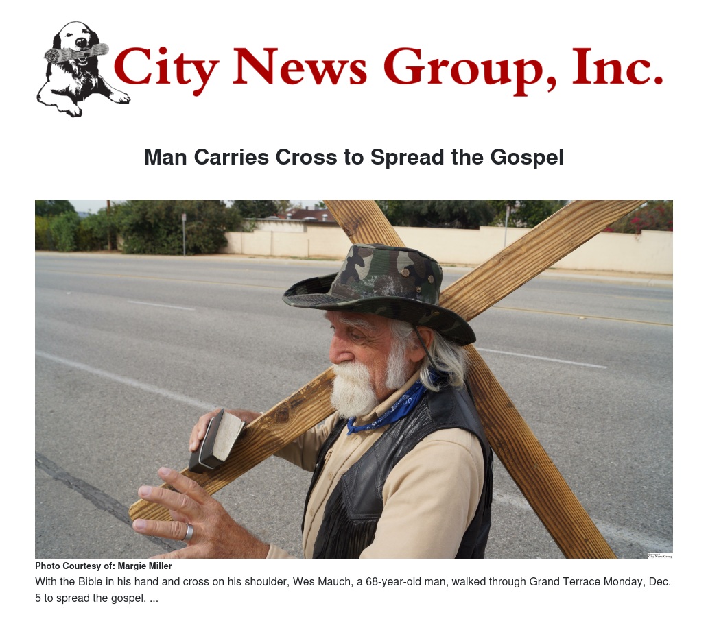 GRAND TERRACE>> With a wooden cross on his shoulder, Wes Mauch, a 68-year-old man, has traveled to 770 cities and towns in California to spread the gospel, including Grand Terrace.