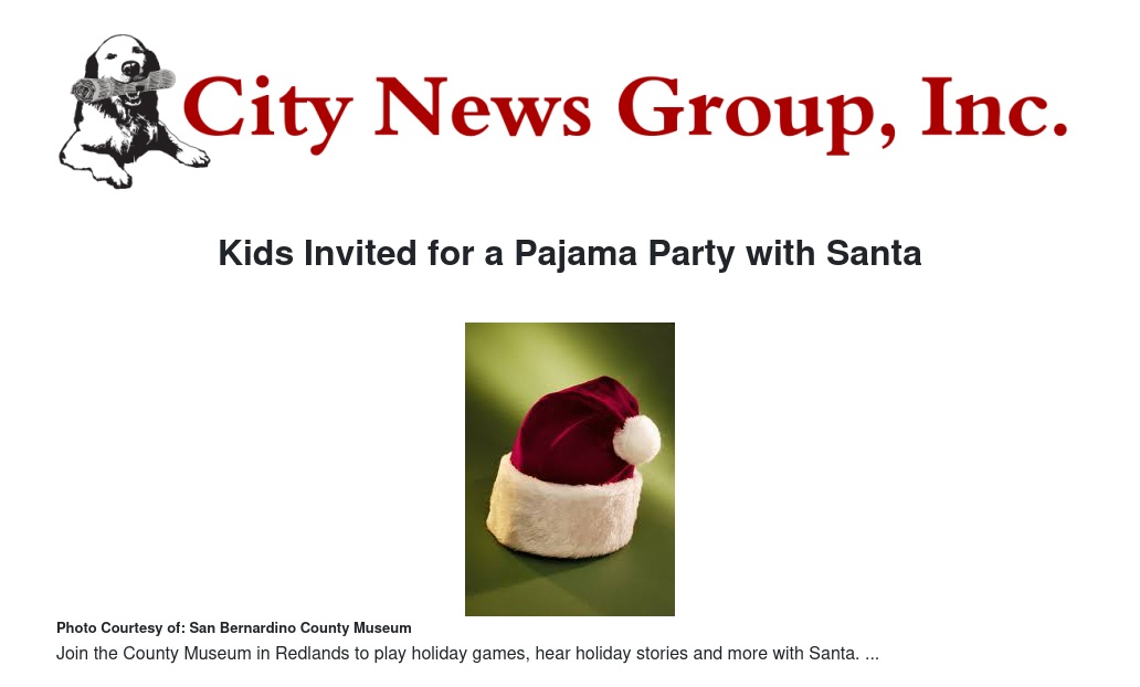Santa will visit families at the San Bernardino County Museum in Redlands at two pajama parties, Friday, Dec. 6 and Saturday Dec. 7, from 6 to 8 p.m.
