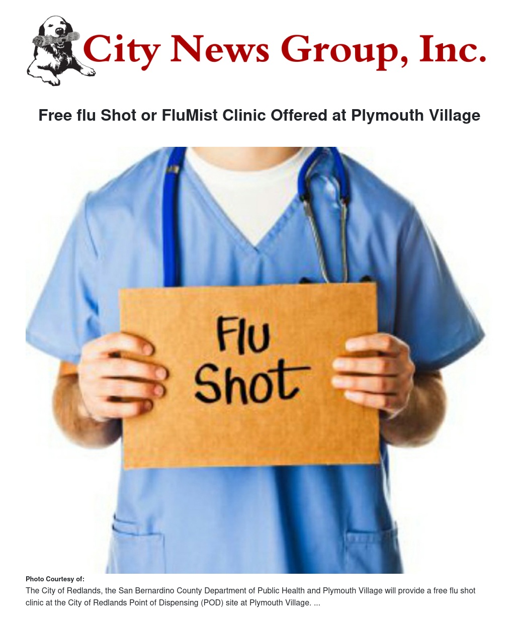 The City of Redlands, the San Bernardino County Department of Public Health and Plymouth Village will provide a free flu shot clinic at the City of Redlands Point of Dispensing (POD) site at Plymouth Village, located at 900 Salem Drive, from 4 to 6 p.m. on Monday, Dec. 1.