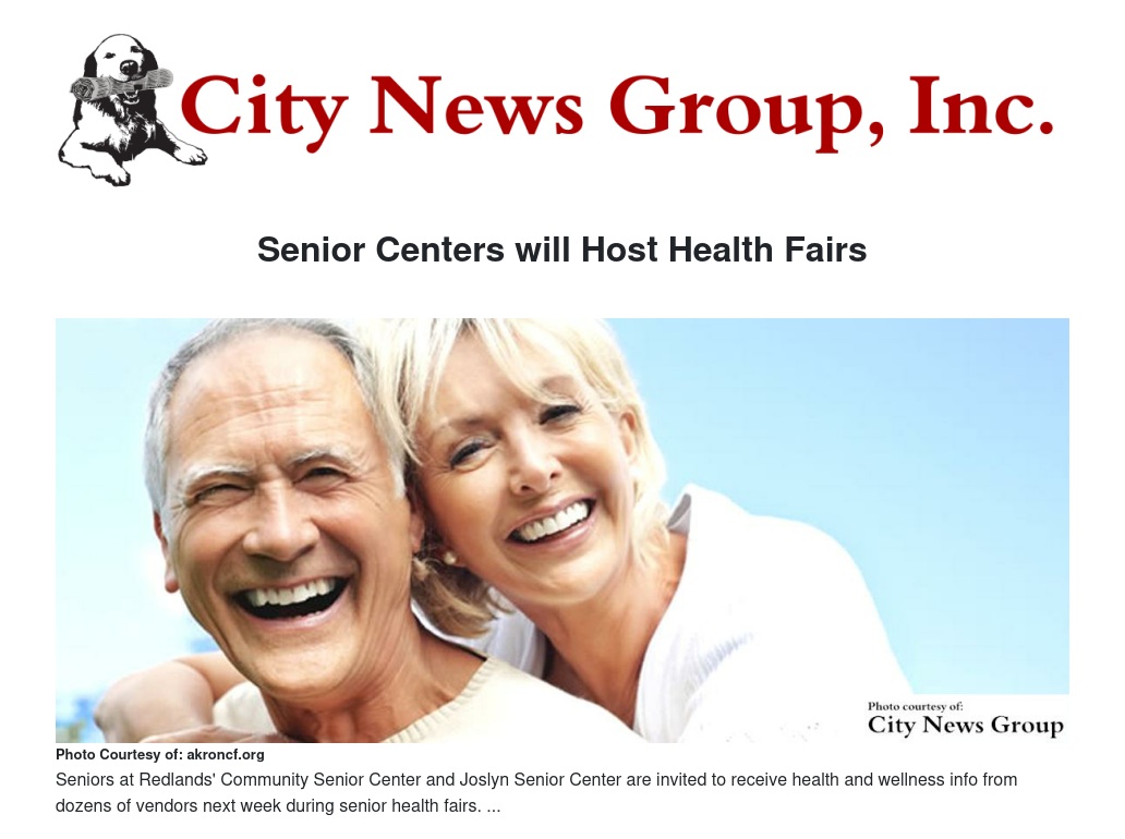 The Redlands Community Senior Center and Joslyn Senior Center will each host Senior Health Fairs May 14 and 15. More than 25 vendors from all over San Bernardino County will be on hand to provide free information on promoting healthy living and ways to stay healthy and active.
