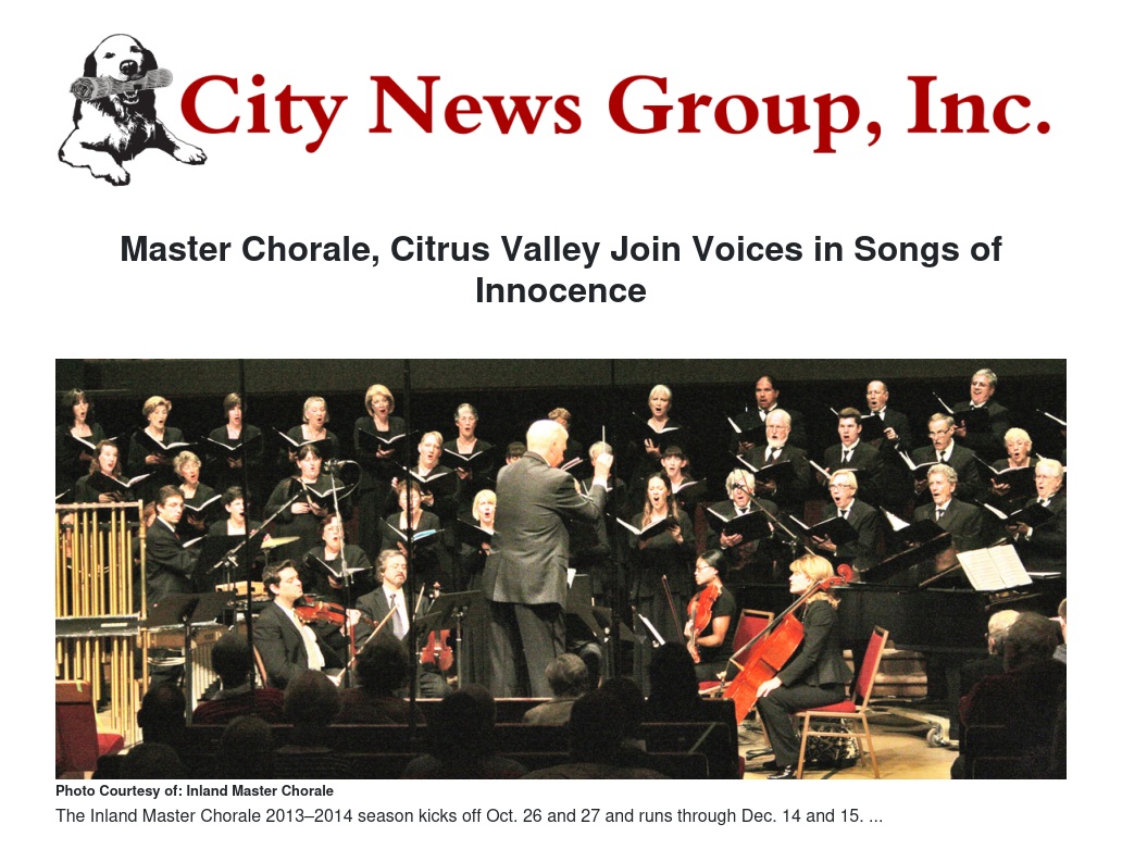 The Inland Master Chorale begins their 2013–14 season with Songs of Innocence, accompanied by a chamber orchestra, on Oct. 26 and 27 at the First United Methodist Church located at One East Olive Avenue in Redlands.