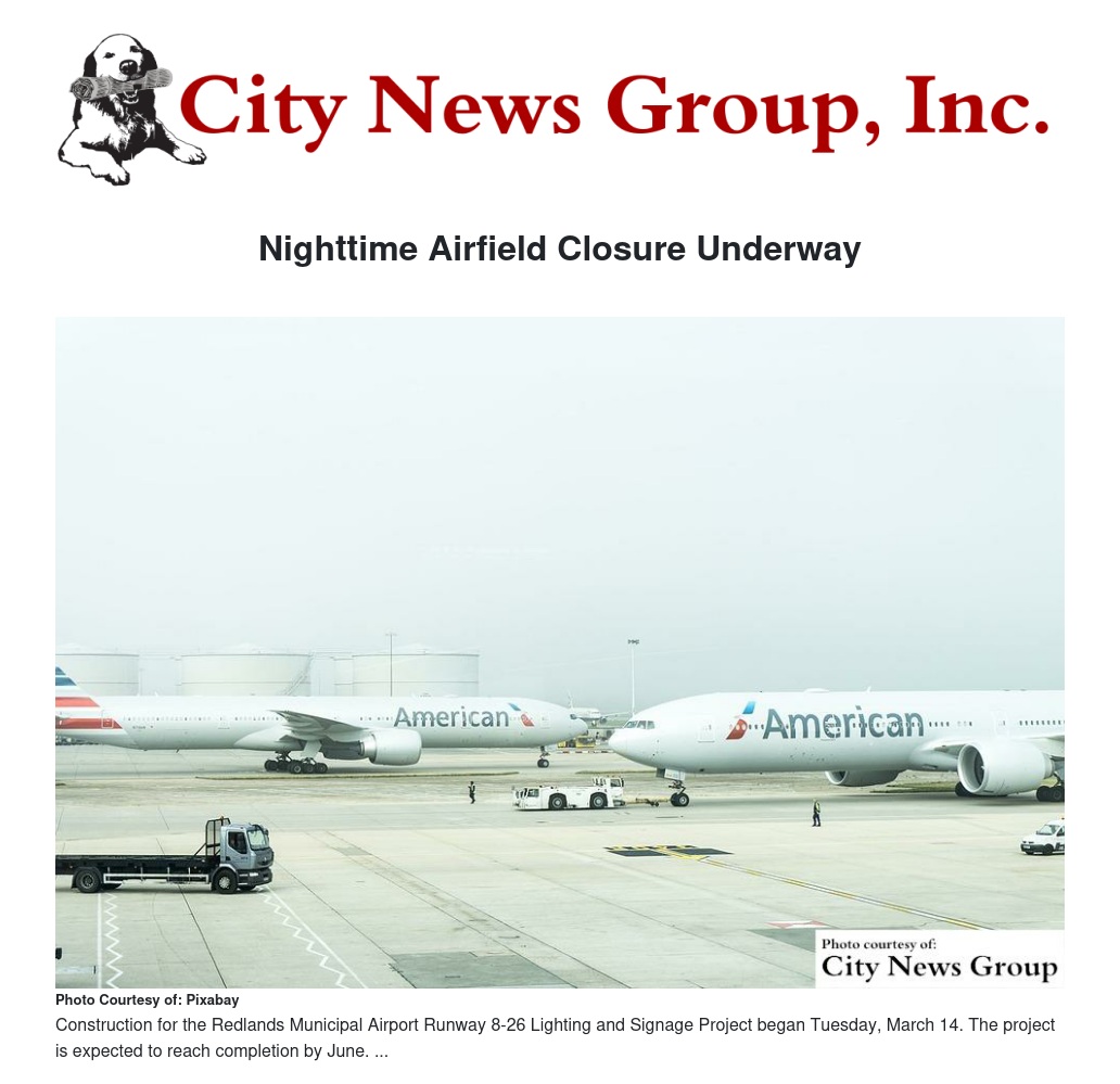 REDLANDS>> A full nighttime airfield closure at Redlands Municipal Airport began April 30 to allow for construction and installation of airport lighting and signage. The runway and taxiway will be closed and no aviation activity will be permitted between the hours of 8 p.m. and 7 a.m, Sundays through Thursdays. The airfield will be open Friday and Saturday evenings. The closure is expected to last through May 23.