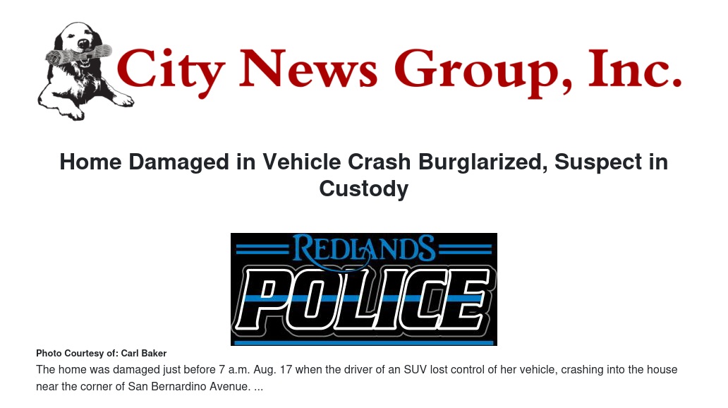 The home was damaged just before 7 a.m. Aug. 17 when the driver of an SUV lost control of her vehicle, crashing into the house near the corner of San Bernardino Avenue.