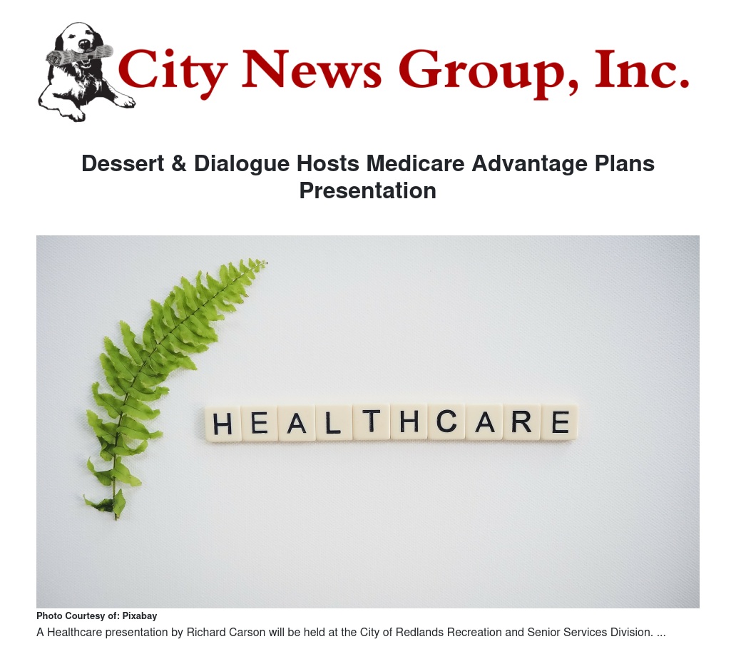 The City of Redlands Recreation & Senior Services Division will host a presentation to learn about Medicare Advantage Plans with Richard Carson, a licensed insurance agent who specializes in Medicare Advantage Plans.