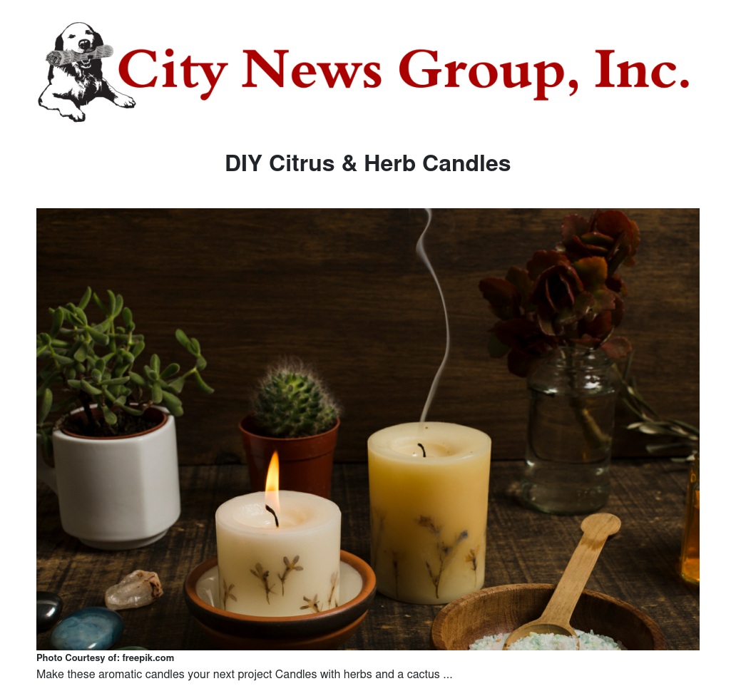 Decorate jars: Place dried citrus slices and herbs around the sides of the jar. (Tip: Press them against the glass so they show through once the wax sets.)