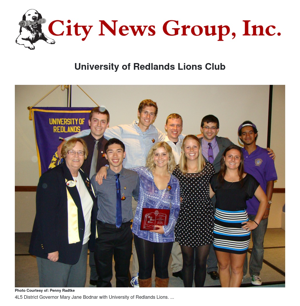 The Grand Terrace Lions Club is their sponsoring Lions Club. 4L5 2nd Vice District Governor and Grand Terrace Lion David Radtke served as host with 4L5 District Governor Mary Jane Bodnar officially inducting the Charter Members and Officers into Lions Clubs International. The University of Redlands Lions Club was awarded Outstanding New Club by the University of Redlands.