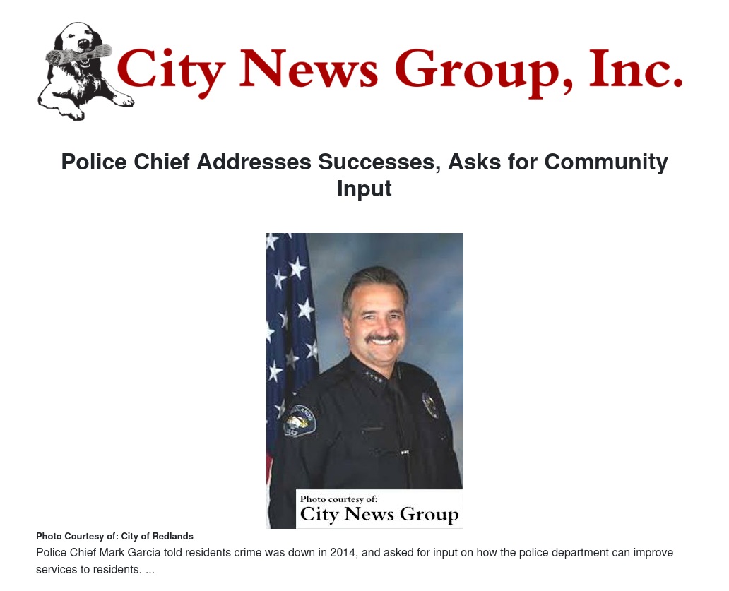 Garcia opened the meeting at the Ayres Hotel on Colton Avenue by sharing some good news: city crime decreased in 2014, with statistics showing a 30 percent reduction in violent crime, a 6 percent reduction in property crime and a 17 percent increase in arrests, Garcia said.