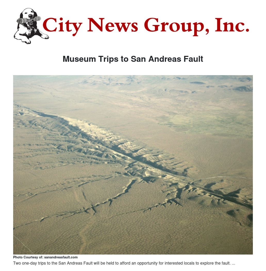 Reservations are now being accepted for two one-day trips to explore the San Andreas Fault led by San Bernardino County Museum Senior Curator Kathleen Springer and Curator of Paleontology Eric Scott. On Saturday, Sept. 21, a day trip will explore the ShakeOut rupture from Redlands to Los Angeles County. On Saturday, Oct. 12, a day trip heads from Redlands to the Salton Sea to look at the epicenter of the ShakeOut scenario. Registration is open for one or both excursions, which are organized by the San Bernardino County Museum Association. The trips both precede the Great California ShakeOut, the world’s largest earthquake drill, scheduled at the County Museum on October 17 at 10:17 a.m.