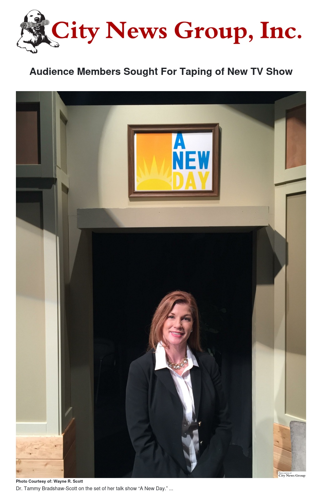 REDLANDS>> The public is invited to join the audience of a new television program featuring contemporary topics to be recorded live in Redlands. The half-hour show, titled "A New Day," is hosted by Dr. Tammy Bradshaw-Scott, creator of the program.