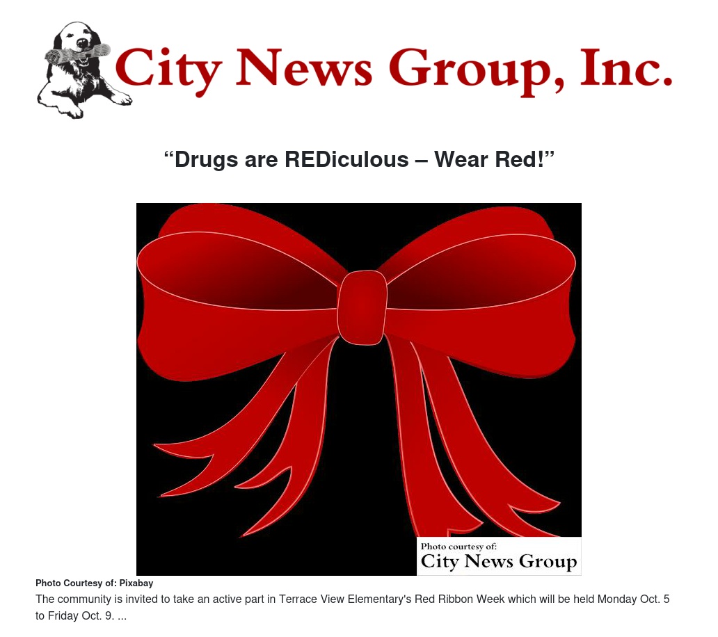 Red Ribbon Week at Terrace View Elementary (TVE) will be held on October 5th through the 9th, and the Red Ribbon Week Committee encourages the community to show support by wearing red shirts, red ribbons and displaying red ribbons at their homes and businesses during that week.