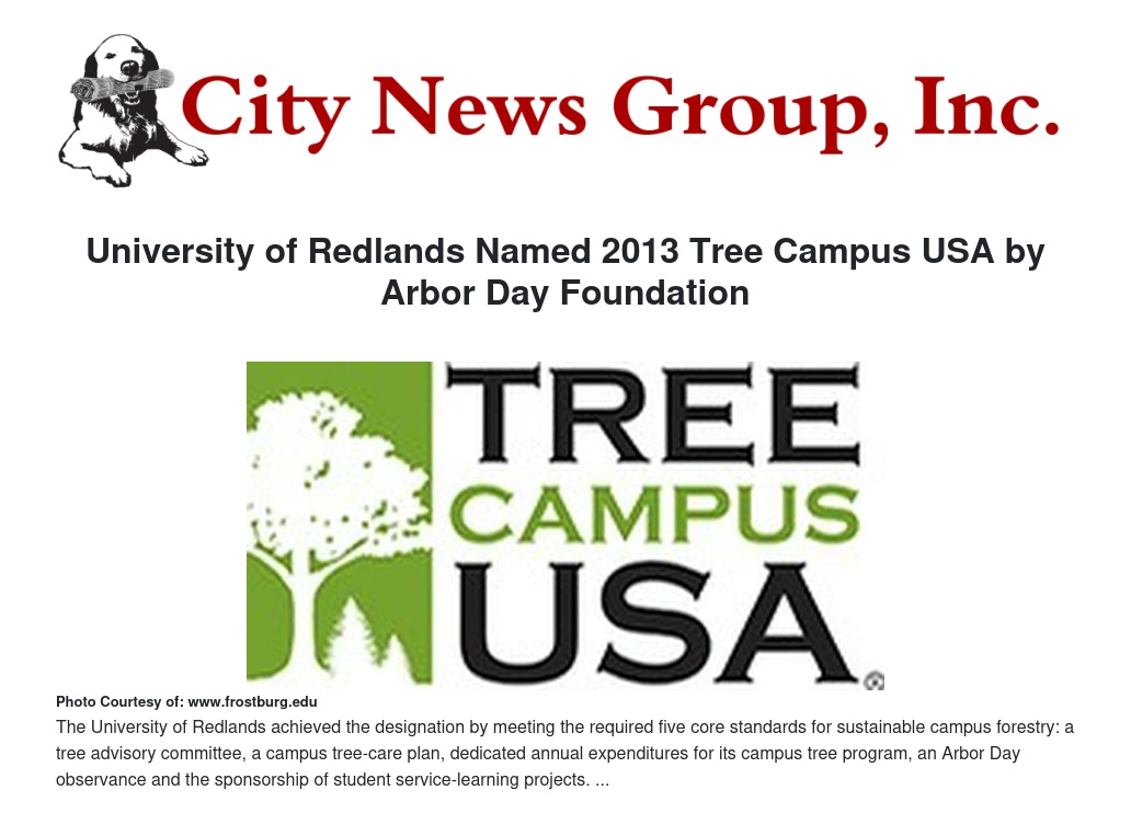 The Arbor Day Foundation has named the University of Redlands a 2013 Tree Campus USA in honor of its commitment to effective community forestry management. This is the fifth year of recognition for the University.