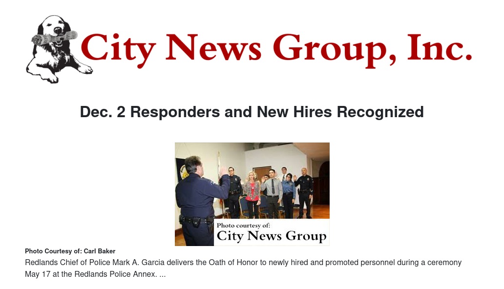 The Redlands Police Department recently held a ceremony to swear in one newly hired police officer, seven newly hired professional staff and a newly promoted police corporal. The department also presented campaign ribbons to all of its personnel who provided assistance to the department on Dec. 2, 2015, after the attack in San Bernardino.