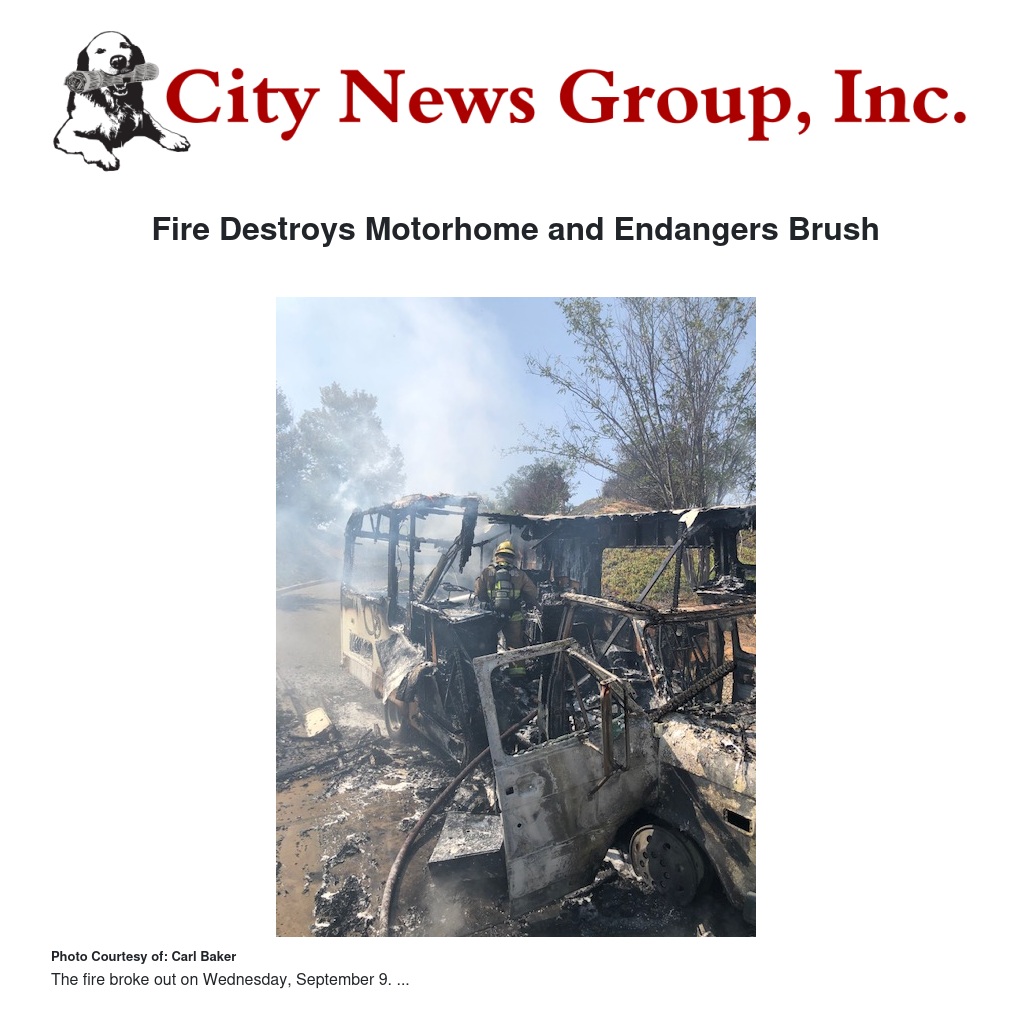 The Redlands Fire Department responded to a working fire in a Class C motorhome in front of a residence in the 13100 block of South Avenue shortly after 2 p.m. Wednesday afternoon, Sept. 9. No injuries were reported.