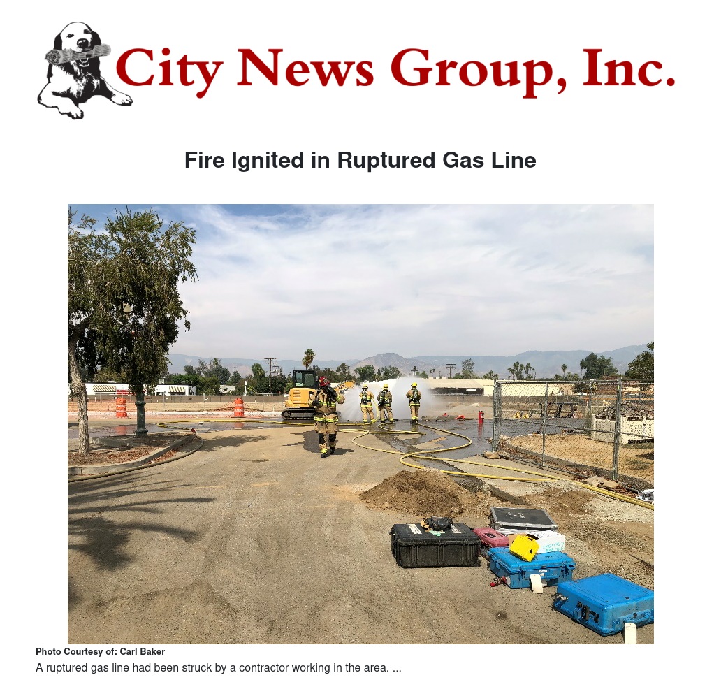 Upon arrival, firefighters found a ruptured gas line that had been struck by a contractor working in the area. Southern California Gas Company arrived shortly before the Fire Department and began assessing the situation. Firefighters remained on scene to assist the Gas Company and to provide for public safety.