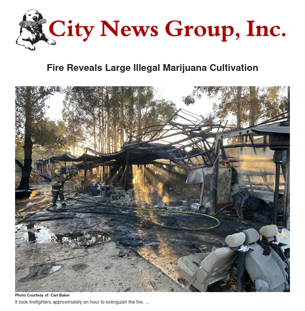 Firefighters responded to a call of a structure fire in the 12800 block of San Timoteo Canyon Road at approximately 4:30 a.m. Wednesday, Nov. 24. Upon arrival, crews found one 100-by-20-foot outbuilding well involved in flames. The fire had also spread through nearby eucalyptus trees to a second outbuilding where firefighters discovered a sophisticated marijuana cultivation operation.