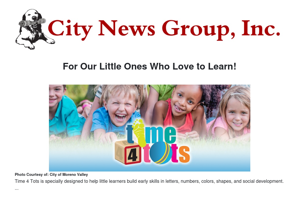 Time 4 Tots is specially designed to help little learners build early skills in letters, numbers, colors, shapes, and social development. Participants engage and interact through games, play, music, art, and storytelling. The program is perfect for potty-trained kids ages three to five.