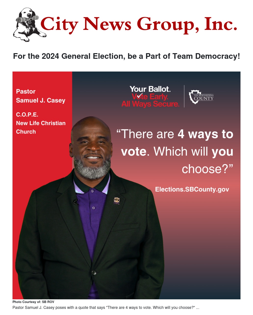 As the November 5, 2024, General Election approaches, the San Bernardino County Registrar of Voters is committed to informing registered voters in San Bernardino County about how, when, and where to vote.